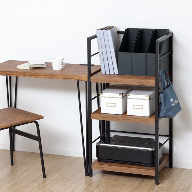 木目調の棚板とスチールフレームを組み合わせた、圧迫感のないシンプルなデザイン。リビング・キッチン・ワークスペースなど、置く場所を選ばず使える便利なラックです。