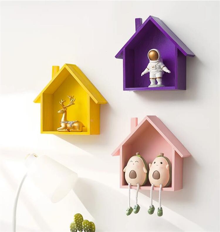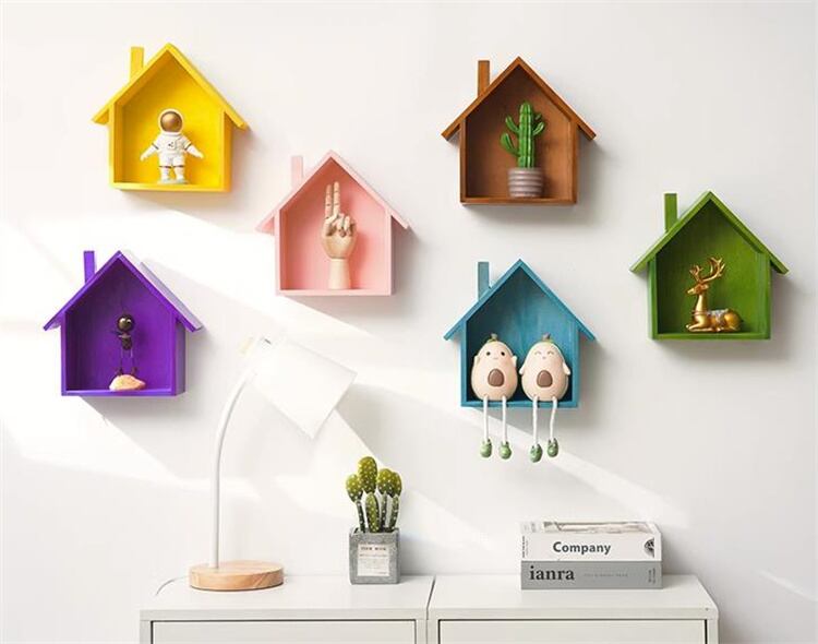 カラフルなハウス型デザインが目を引く、壁掛けタイプのデコレーションシェルフ。