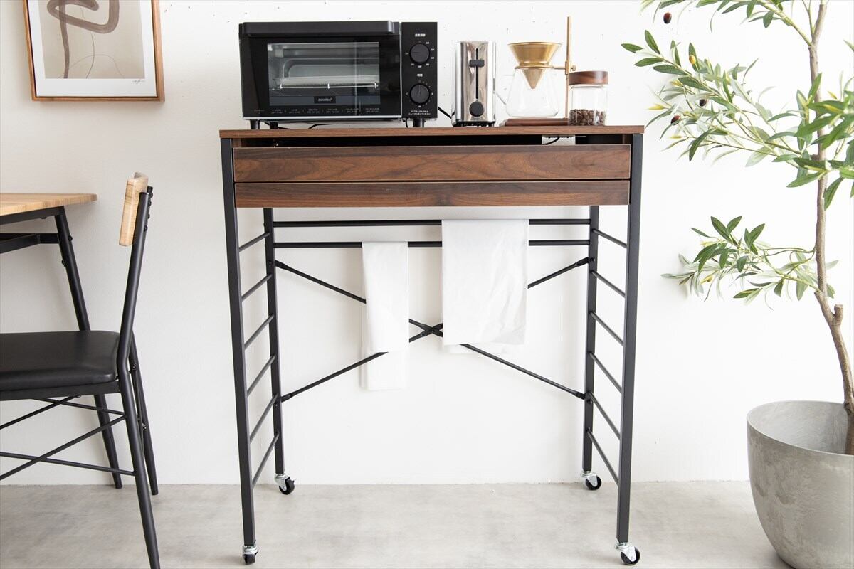 天板下には引き出しとスライドトレーを備え、カトラリーやキッチン小物の収納にも便利。