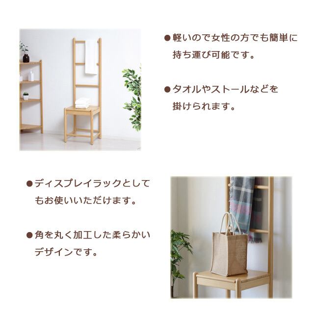 チェアとしてはもちろん、タオルやストールを掛けたり、ディスプレイラックとしても使える多用途な一脚です。